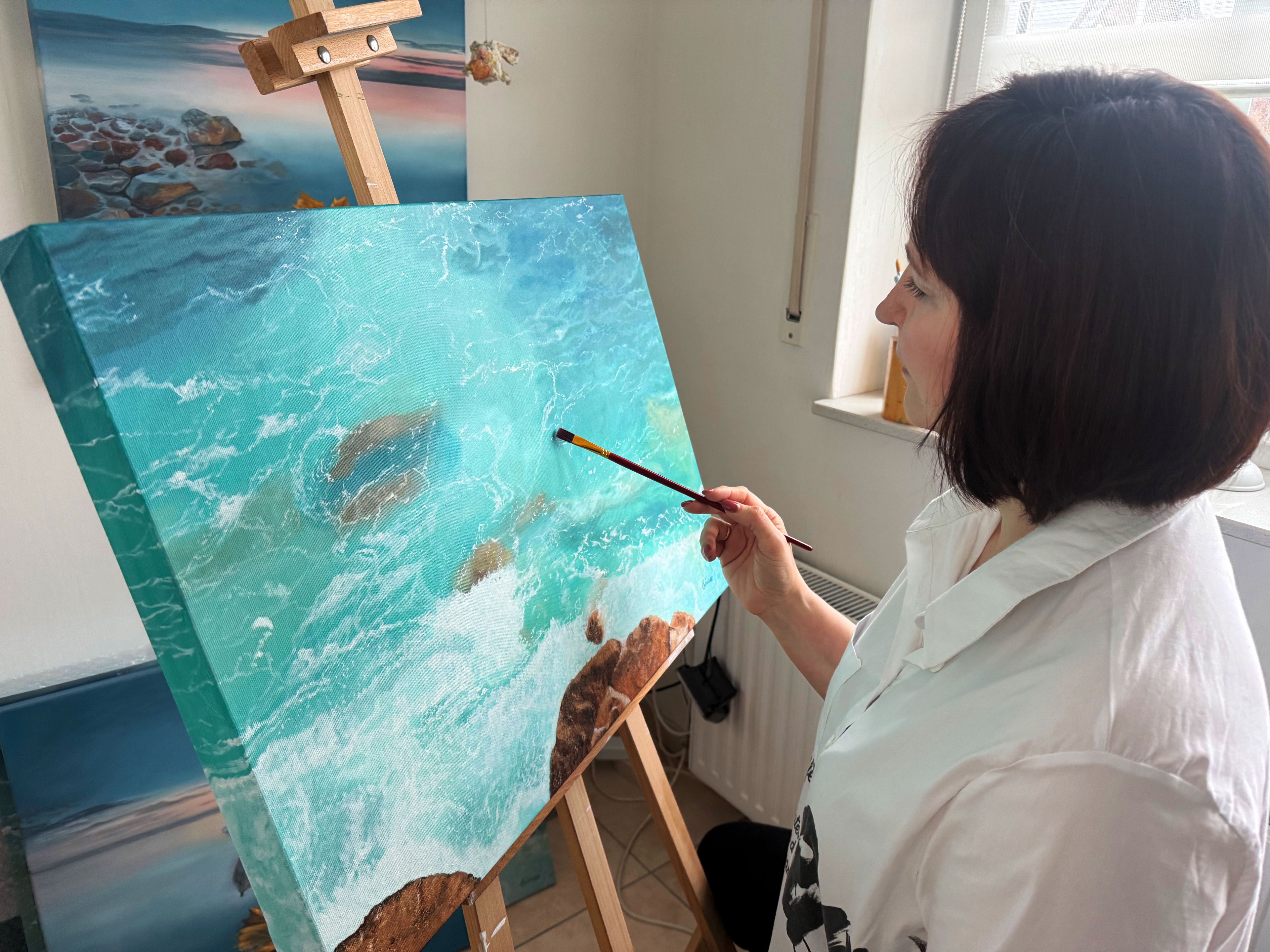 Ich arbeite seit 2021 als autodidaktische Künstlerin. Am Anfang habe ich mit verschiedenen Themen und Materialien experimentiert, vor allem mit Acrylfarben. Seit 2023 male ich hauptsächlich mit Ölfarben und habe mein zentrales Thema gefunden: das Meer.